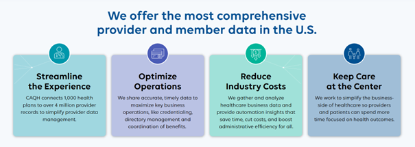 The Council for Affordable Quality Healthcare aims to increase the quality of healthcare services. It provides secure communication between insurance companies and healthcare professionals in the USA. In addition, information about other healthcare professionals is also in a central system.